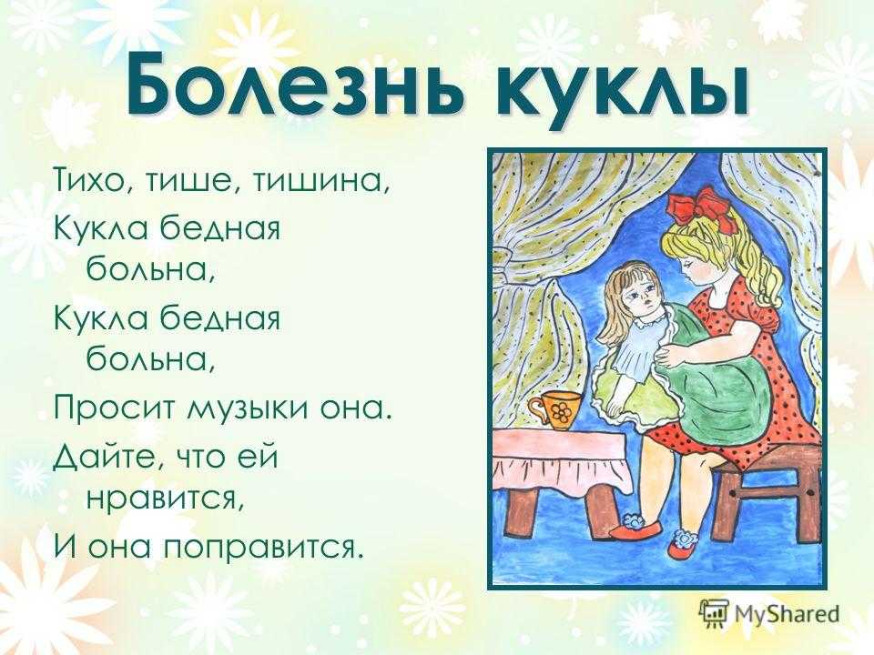 Болезнь куклы Тихо, тише, тишина, Кукла бедная больна, Просит музыки она. Дайте, что ей нравится, И она поправится.