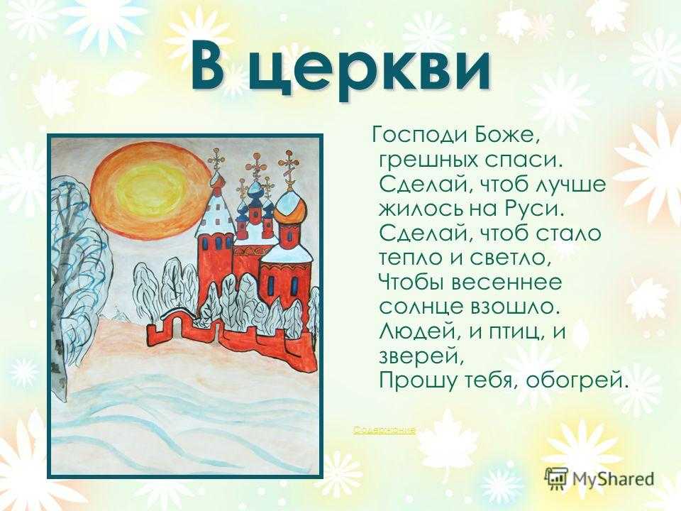 В церкви Господи Боже, грешных спаси. Сделай, чтоб лучше жилось на Руси. Сделай, чтоб стало тепло и светло, Чтобы весеннее солнце взошло. Людей, и птиц, и зверей, Прошу тебя, обогрей. Содержание