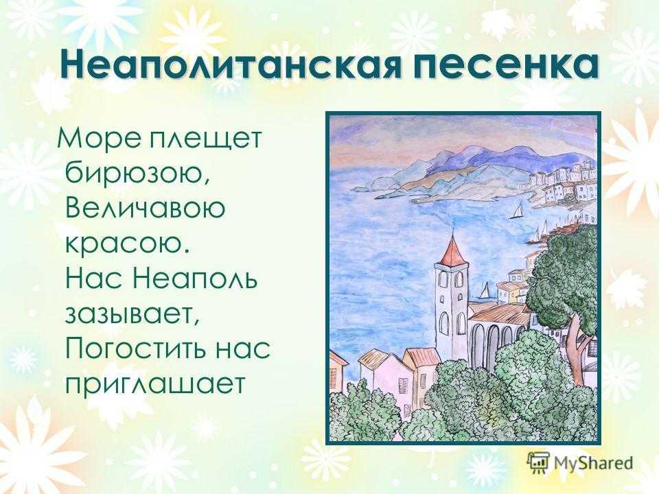 Неаполитанская песенка Море плещет бирюзою, Величавою красою. Нас Неаполь зазывает, Погостить нас приглашает