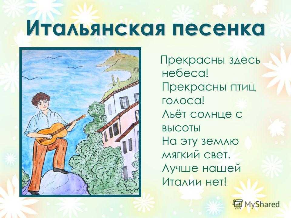 Итальянская песенка Прекрасны здесь небеса! Прекрасны птиц голоса! Льёт солнце с высоты На эту землю мягкий свет. Лучше нашей Италии нет!