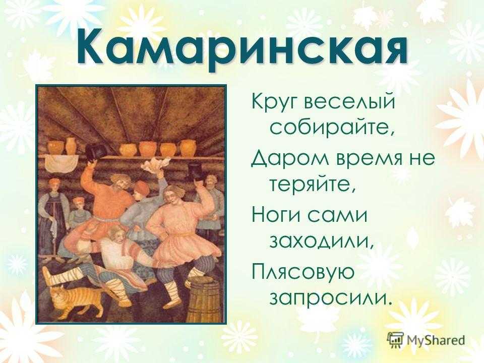 Камаринская Круг веселый собирайте, Даром время не теряйте, Ноги сами заходили, Плясовую запросили.