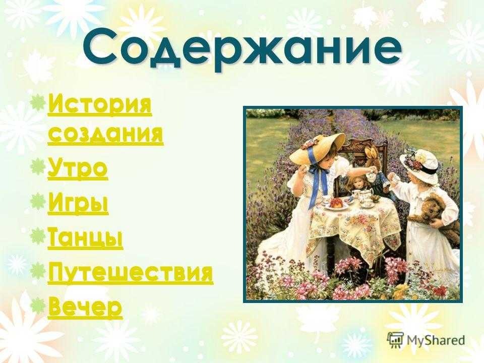 Содержание История создания Утро Игры Танцы Путешествия Вечер История создания Утро Игры Танцы Путешествия Вечер