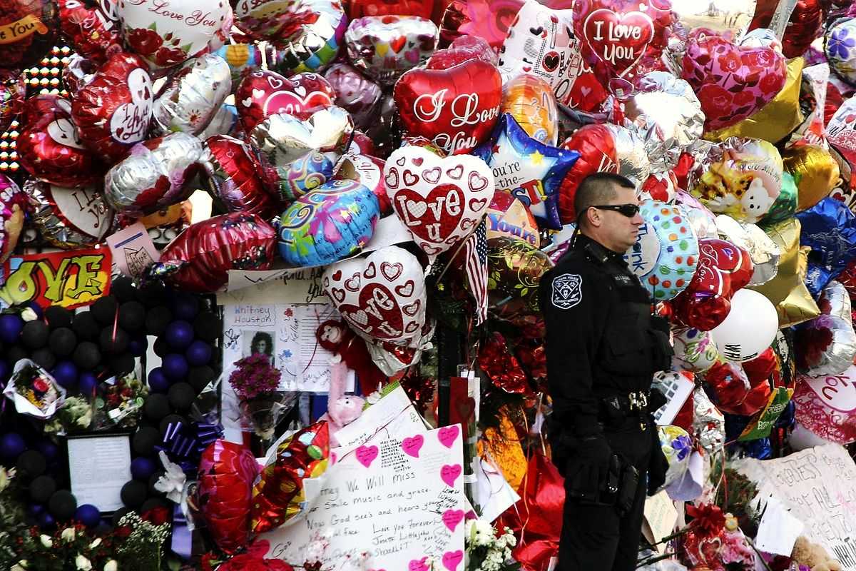 Полицейский стоит на страже перед импровизированным мемориалом перед похоронами Уитни Хьюстон возле баптистской церкви Нью-Хоуп в Нью-Джерси, 18 февраля 2012 г. Место захоронения певицы Уитни Хьюстон на кладбище Фэйрвью была похоронена рядом с ее отцом Джоном в Нью-Джерси, 20 февраля 2012 г.
