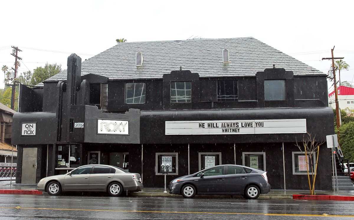 Вывеска на концертном зале «Рокси» гласит: «Мы всегда будем любить тебя, Уитни» через несколько дней после смерти Уитни Хьюстон в Лос-Анджелесе, 15 февраля 2012 г.