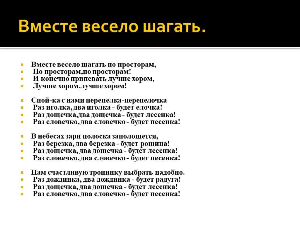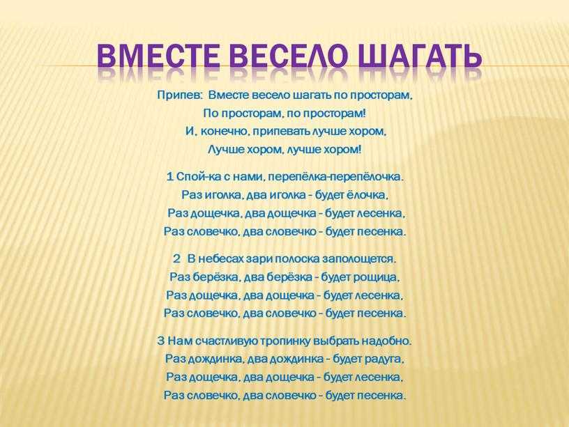 Вместе весело шагать по просторам, По просторам, по просторам И, конечно, припевать лучше хором, Лучше хором, лучше хором. Спой-ка с нами, перепёлка, перепёлочка, Раз иголка, два иголка — будет ёлочка. Раз дощечка, два дощечка — будет лесенка, Раз словечко, два словечко — будет песенка.Припев.